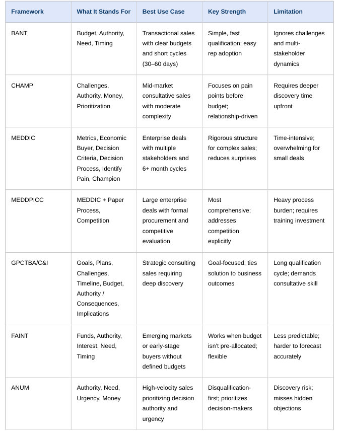 Frameworks vary significantly in complexity, with BANT excelling in speed while MEDDIC provides depth for enterprise complexity. No single framework fits every sales motion. Teams often combine elements from multiple approaches to match their specific buying process.